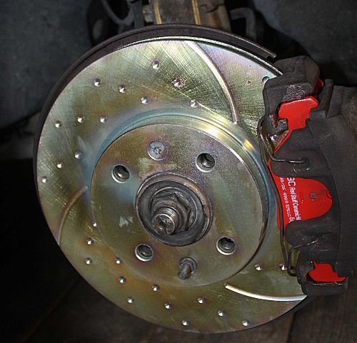 EBC Turbo Groove Discs have a wider slot which actually draws cool air across the pad surface keeping pads and rotors cooler. Turbo Groove Discs also expel dust, dirt and hot gases better than fine slots which eventually fill with rust and scale and become ineffective in our opinion. EBC discs use blind drilled holes to break down surface gases when braking from speed but do not weaken the rotor cross section as can happen with through drilling, thereby lessening the chance of rotors cracking over time and heavy use.